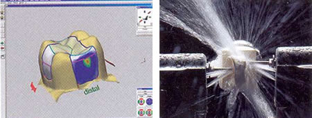 Auf dem PC wird passend zu der Ausdehnung Ihres kariösen Defekts eine Keramikrestauration konstruiert, die daraufhin aus einem Keramikblock nach dem CAD/CAM-Prinzip geschliffen wird. So erhalten Sie eine qualitativ hochwertige und schöne zahnfarbene Versorgung.